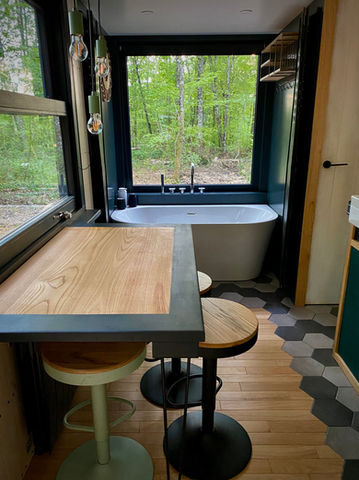+ La grande baignoire face à une grande vitre qui donne sur la forêt.